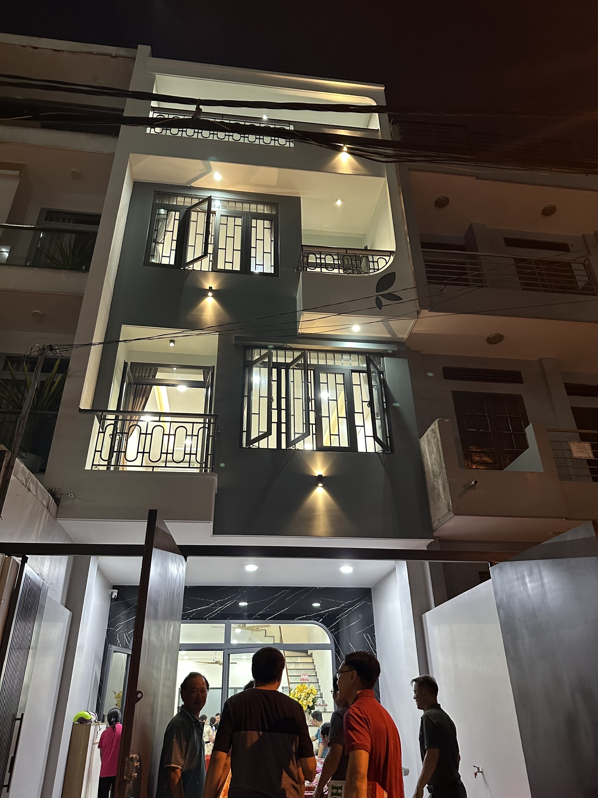 Một công trình nổi bật với kiến trúc tối giản mà tinh tế, sử dụng tông màu xám – trắng sang trọng, kết hợp chất liệu gỗ ốp cao cấp và cửa kính lớn đón trọn ánh sáng tự nhiên.